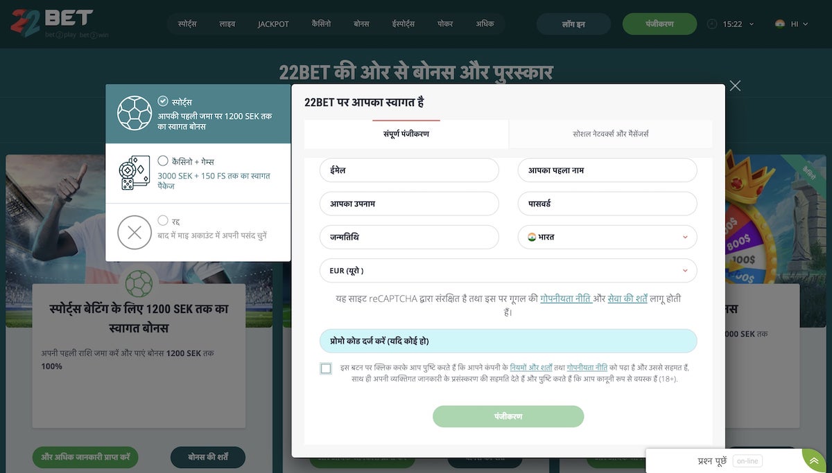Becoming part of the 22bet Casino family is a simple and straightforward process. Here is a step-by-step guide to help you navigate the registration: